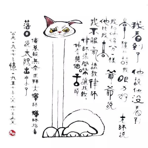 《潇洒云间》 十二属性没有猫,难解之谜遥。猫咪非凡畜,人——不可属猫。“天干”“地支”纪年,高妙卓越。神猫不可纪年,古哲人光辉闪耀。(今奇画语)