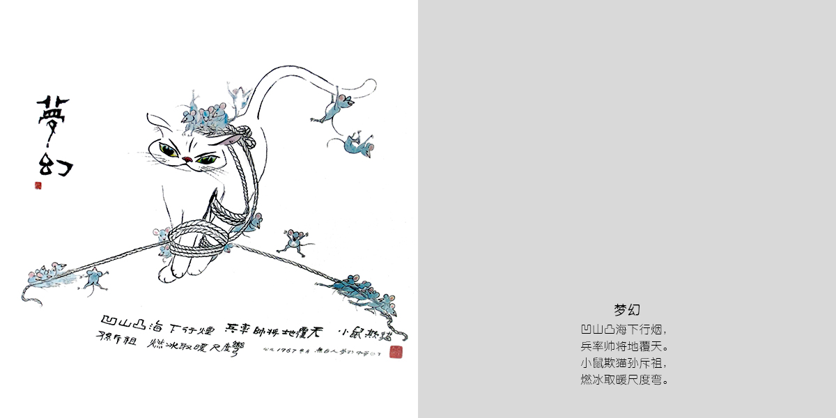 凹山凸海下行烟,兵率帅将地覆天。小鼠欺猫,孙斥祖。燃冰取暖尺度弯。—— 公元1967年冬月,“无目人”梦于中华。 1967年冬天,31岁的今奇在“梦幻”上署名“无目人”。因为看不见现实,只能把梦中幻想的告诉大家(弟子“天猫”解读)